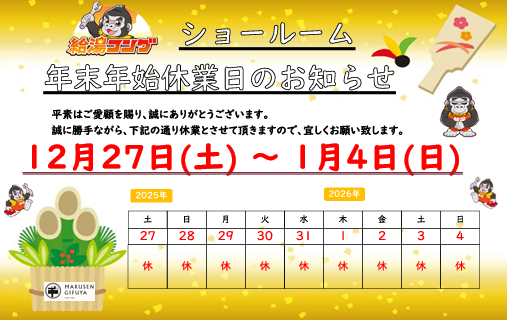 誠に勝手ながら、12月27日(土)~1月4日(日)まで年末年始休業とさせていただきます。